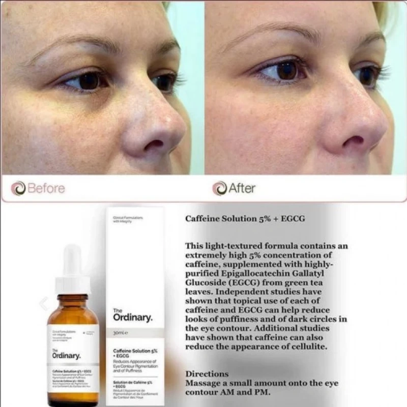 | Caffeine Solution 5% + EGCG Eye Serum is an effective, water-based serum that targets dark circles and puffiness around the eyes, promoting under-eye brightening. Formulated with a 5% concentration of caffeine and epigallocatechin gallatyl glucoside (EGCG), this potent serum helps improve the look of tired eyes while providing a brightening effect. Caffeine works to reduce puffiness, while EGCG works to help reduce the appearance of dark circles.